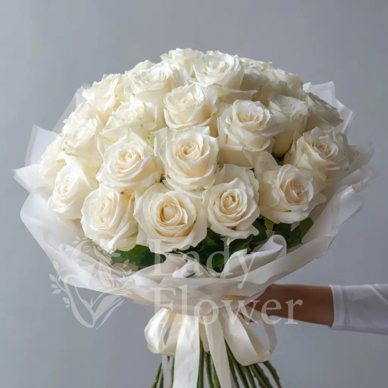 Нежный и лёгкий букет из белых роз, словно облака с каплей утреннего аромата. Прекрасен как подарок для романтических случаев или в качестве комплимента без повода. Сочетает свежесть и деликатность.
