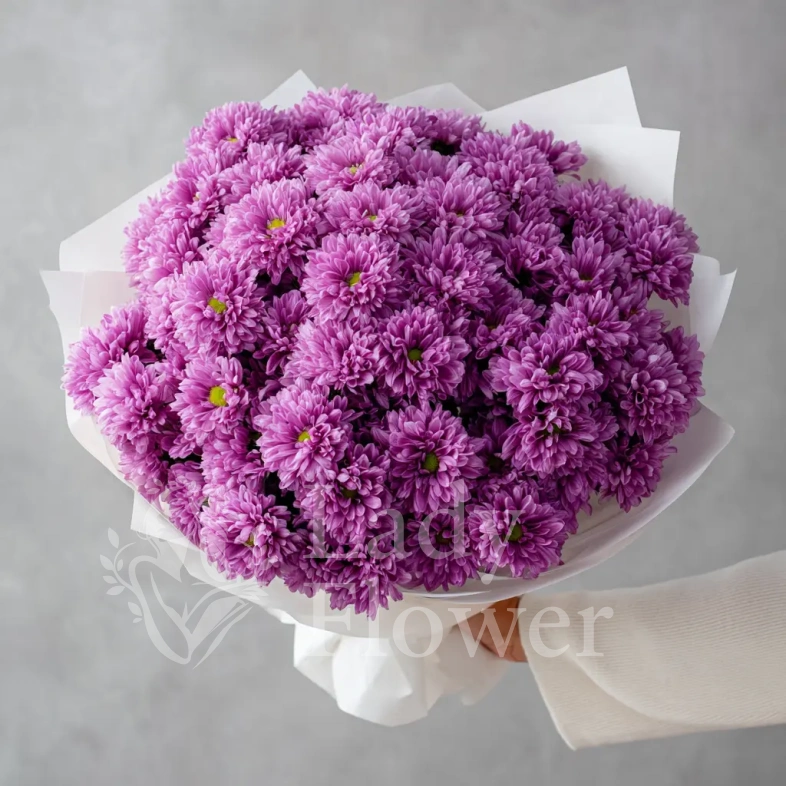 Нежность и загадочность — главные ноты этого букета. Сиреневые хризантемы подойдут для романтичного подарка, акцента на чувствах или комплимента с тонким намёком.