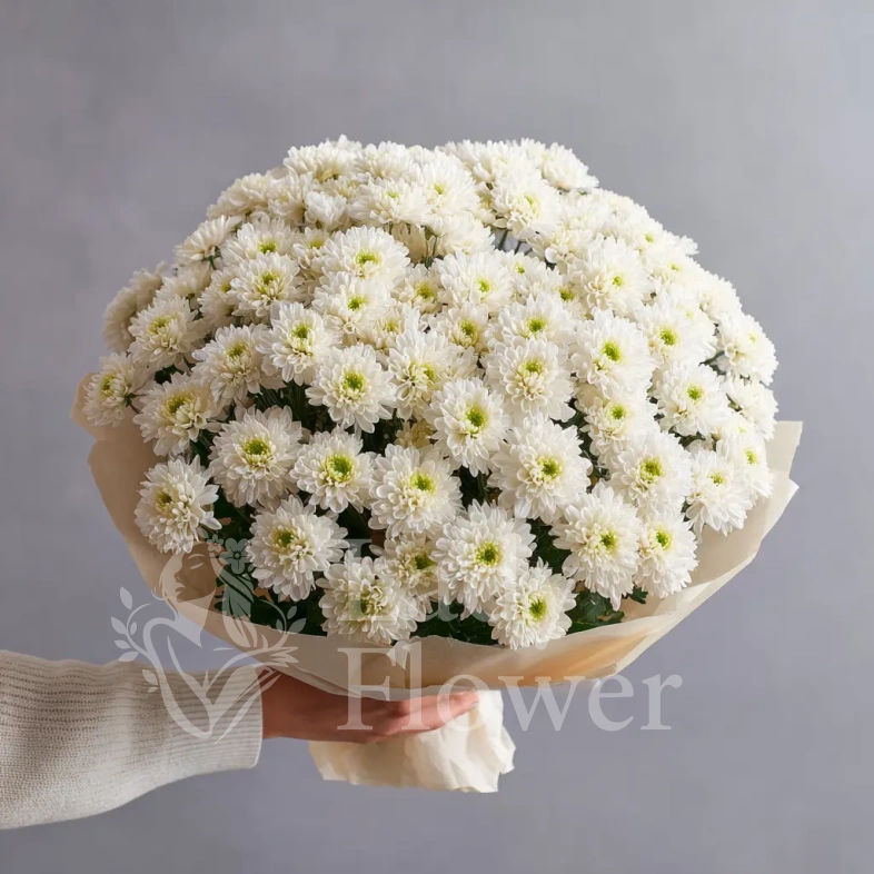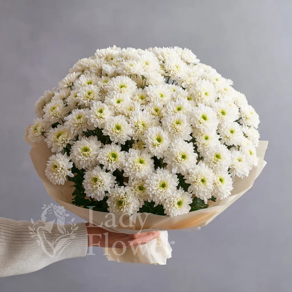 Классический букет из белых кустовых хризантем. Подойдёт для офиса, поздравлений, свиданий и просто — чтобы сделать день ярче.