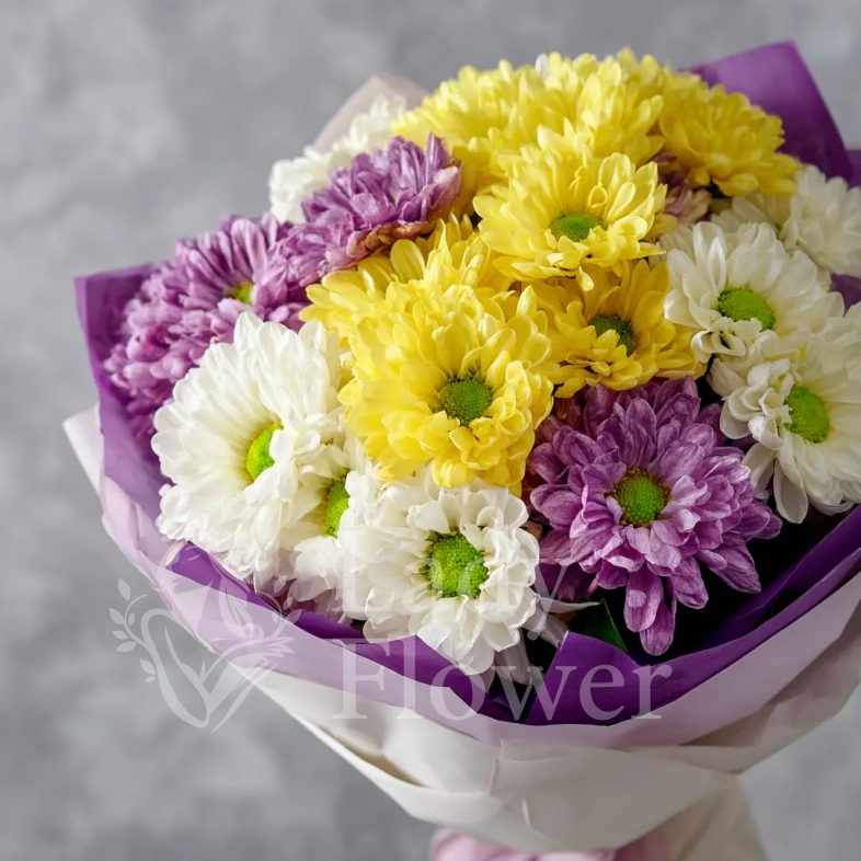ГлавнаяКаталогМонобукетыХризантемыМонобукет из хризантем «Сиреневый рассвет»