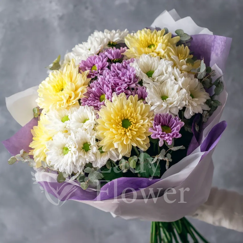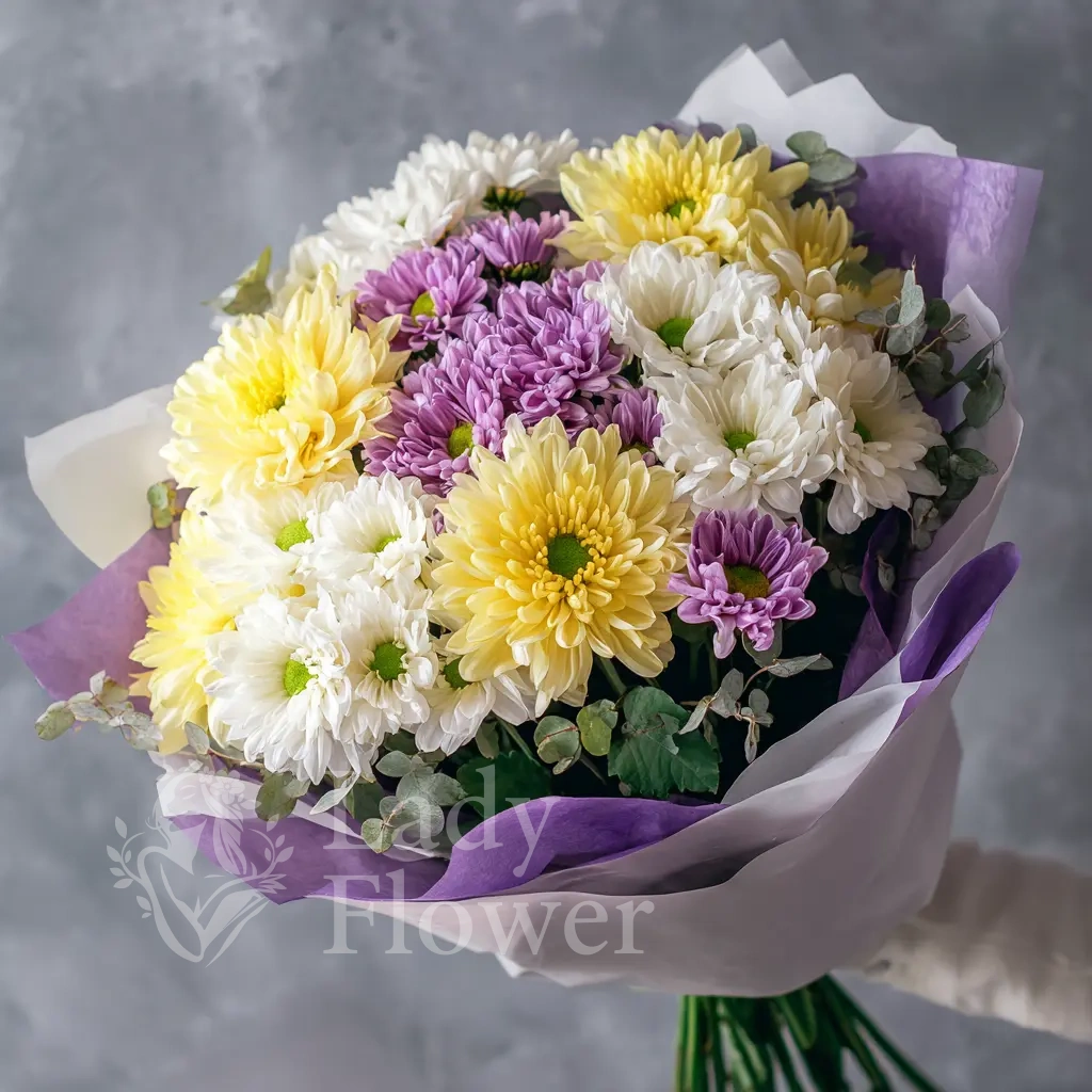 Нежный букет в пастельных сиреневых тонах с акцентами солнечного жёлтого и чистого белого. Создаёт ощущение лёгкости и утренней свежести. Отлично для подарка с романтическим подтекстом или в знак благодарности.