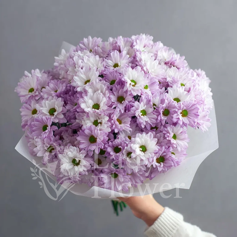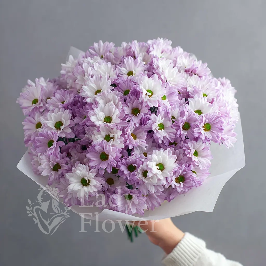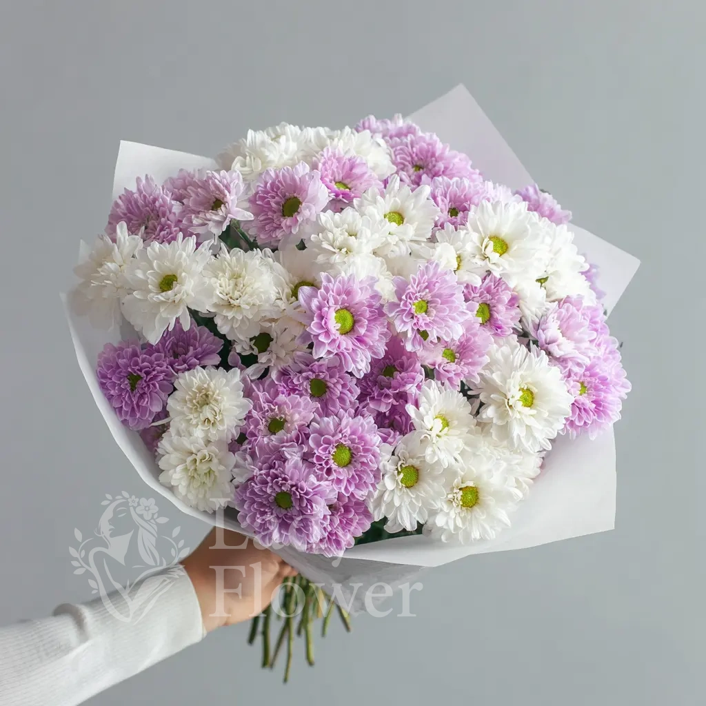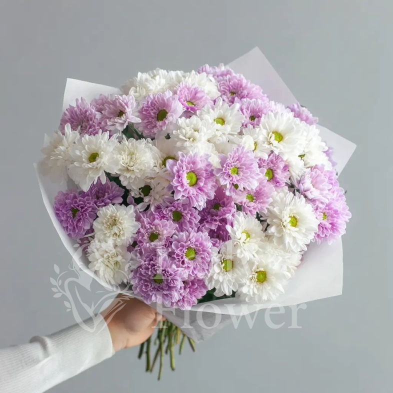 Цветовая нежность делает букет выразительным, а хризантемы обеспечивают стойкость и эффектность на несколько дней.