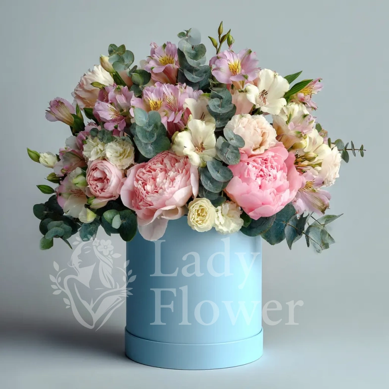 Свежие пионы, альстромерия и эвкалипт создают ощущение летнего утра. Ароматная и легкая композиция для уютных моментов и особых случаев.