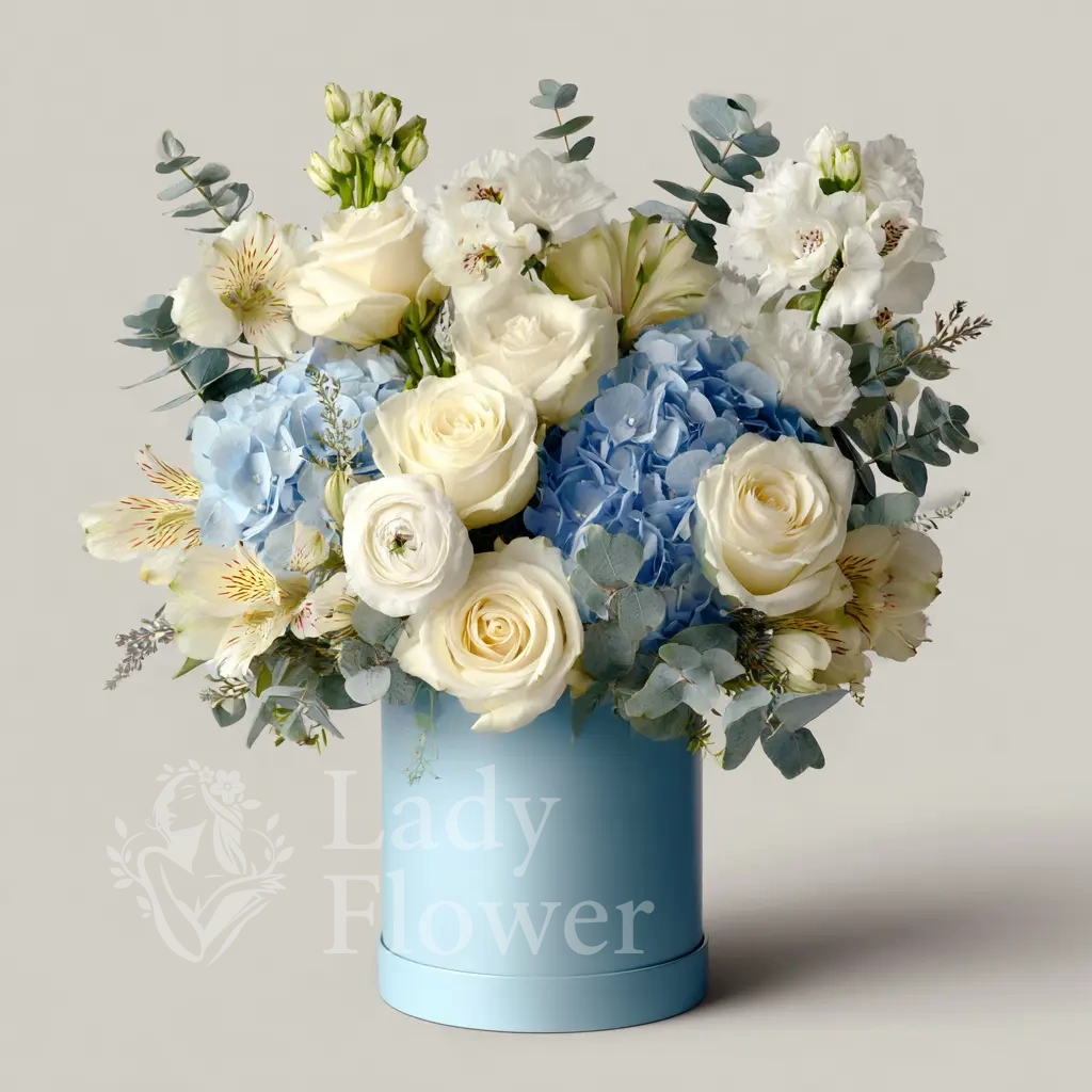 Белые розы, голубая гортензия и серебристый эвкалипт создают волшебную зимнюю атмосферу, наполняя дом теплом и уютом.