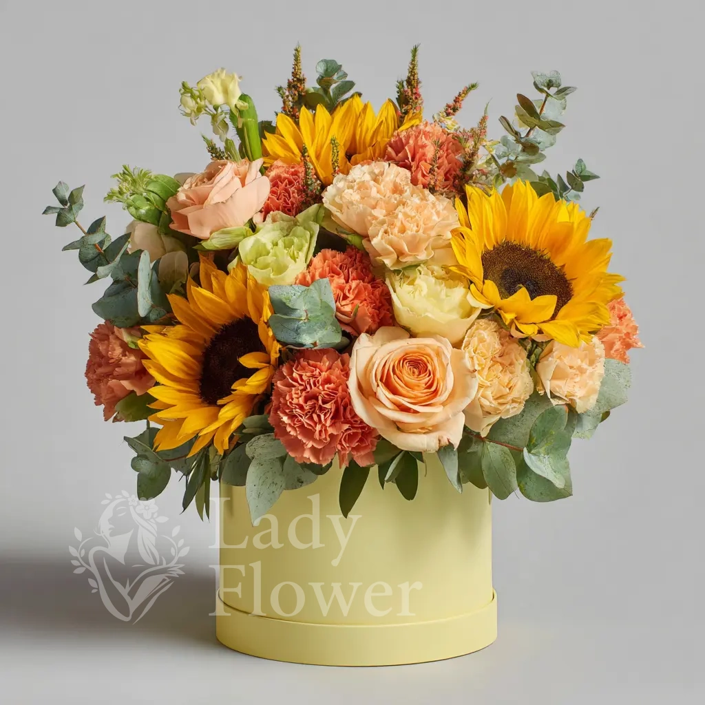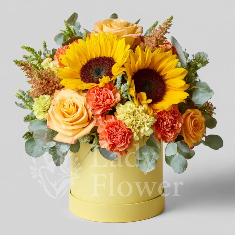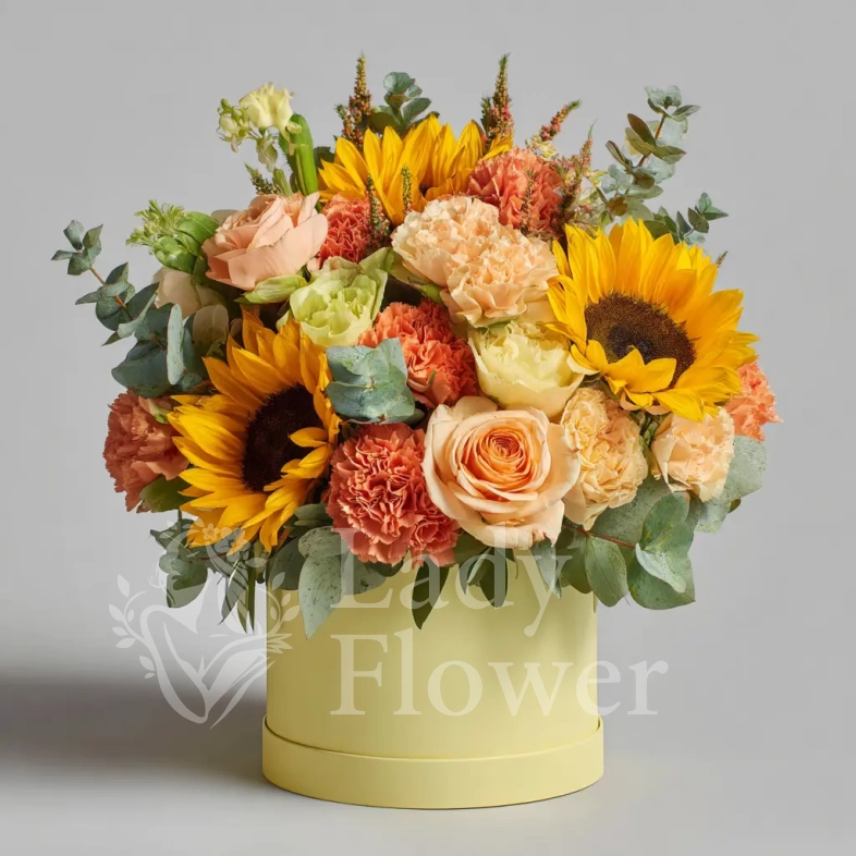 Подсолнухи, оранжевые гвоздики и кремовые розы — яркая палитра для теплых осенних дней.