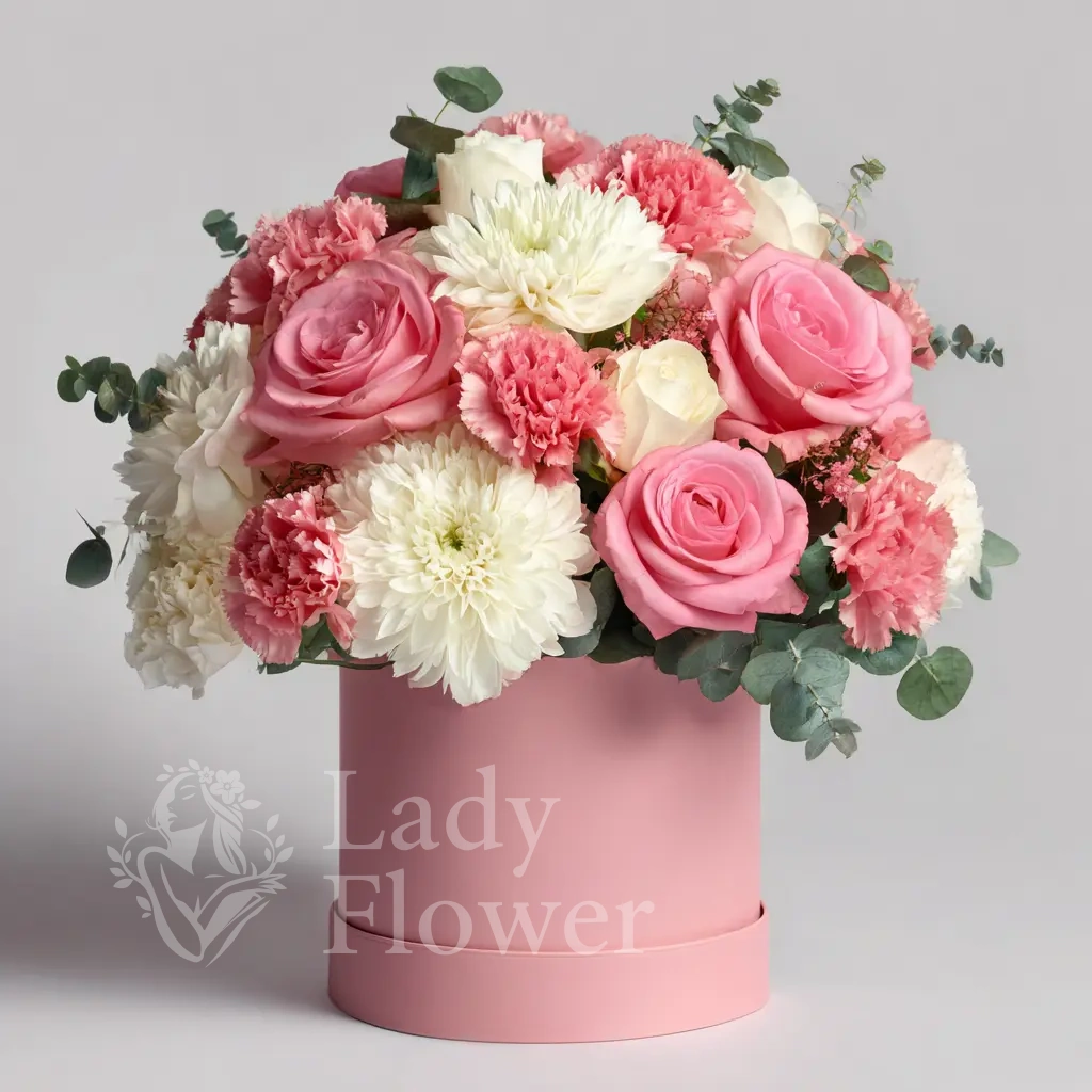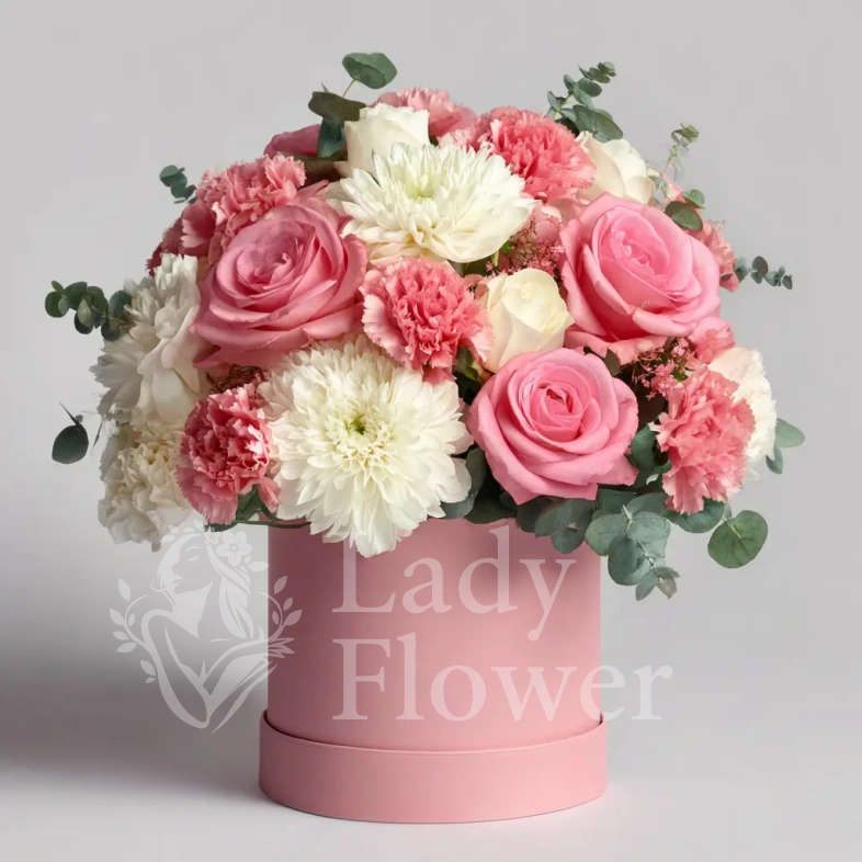 Розовые гвоздики, белая хризантема и розовые розы — яркая композиция для праздничных событий и поздравлений.