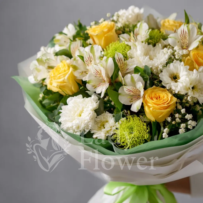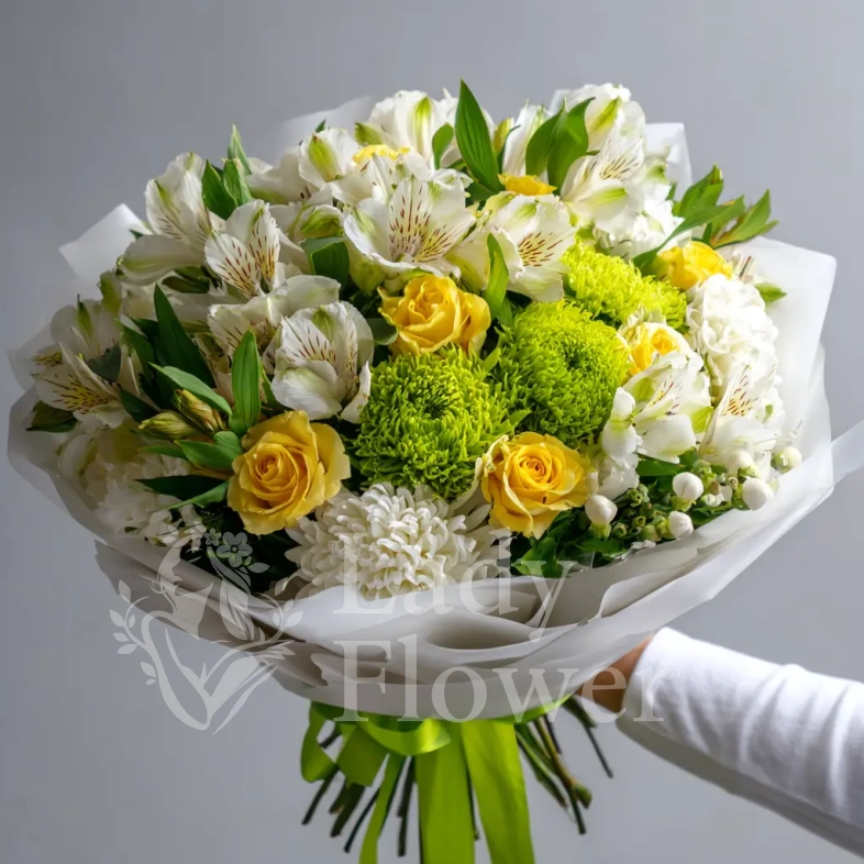 Композиция, как летняя песня — наполнена мягкими красками, теплом и светом. Альстромерии добавляют воздушности и утончённости. Универсальное решение для поздравления женщины или девушки.