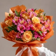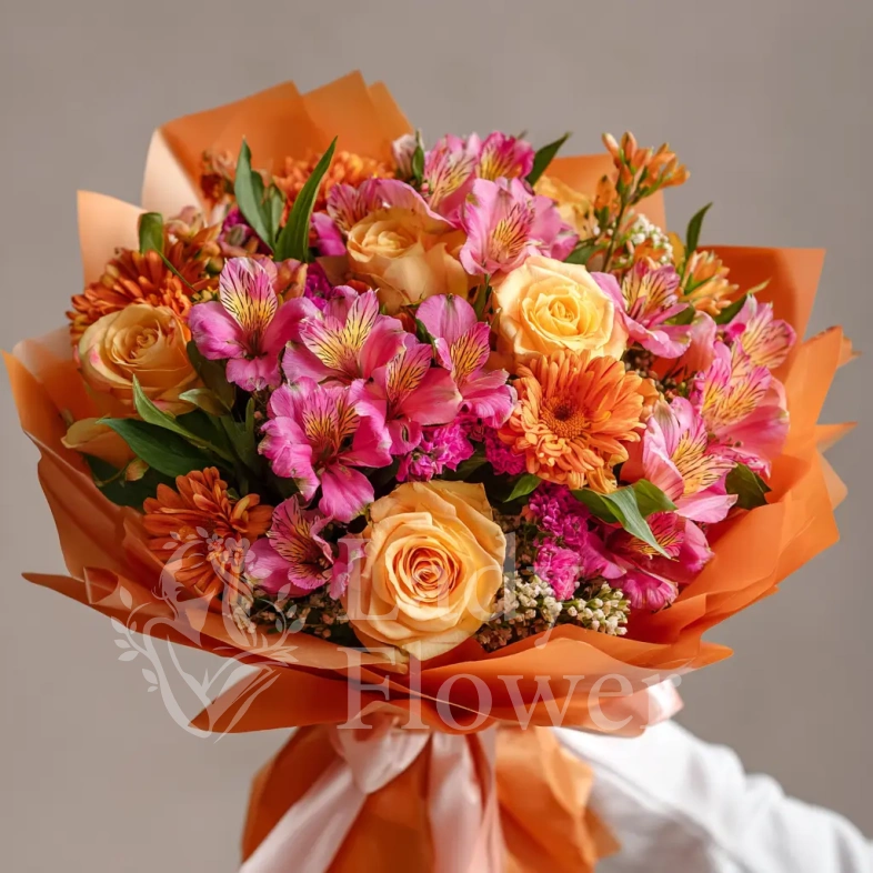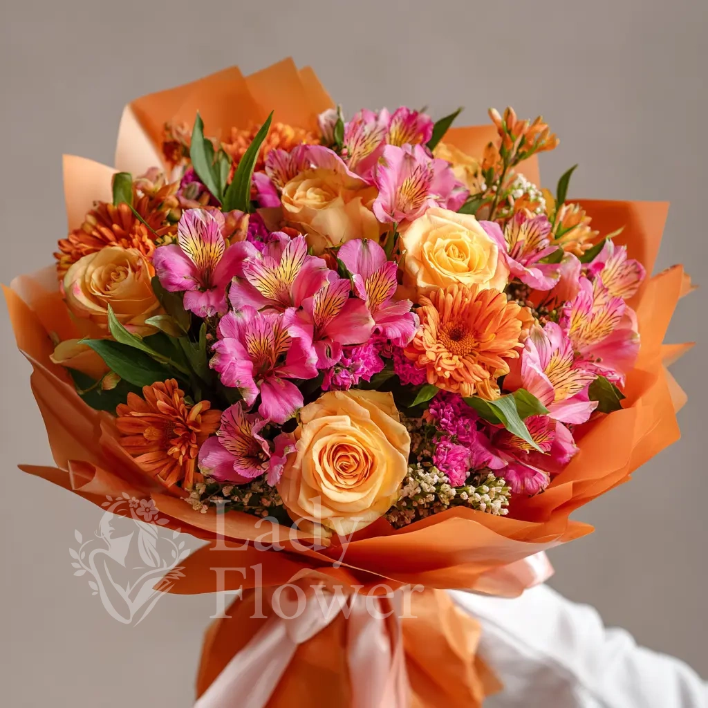 Яркая композиция с праздничным настроением. Альстромерии собраны так, чтобы выразить тепло, благодарность и хорошее настроение. Прекрасный выбор для дня рождения или поздравления с успехом.