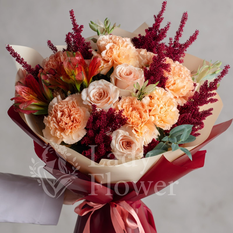 Кремовые гвоздики с бордовыми цветами — загадочный и благородный букет, создающий атмосферу роскошного вечера и незабываемого момента.