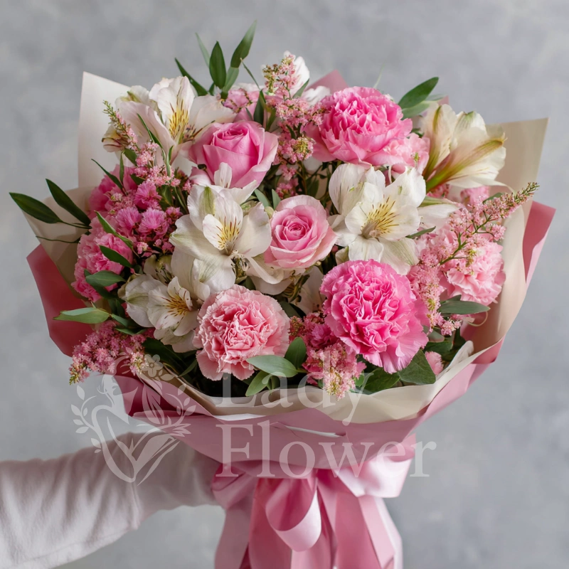 Пушистые розовые гвоздики с зеленью — игривый и романтичный букет для любимой. Идеален для нежных признаний и маленьких сюрпризов, которые хочется запомнить надолго.