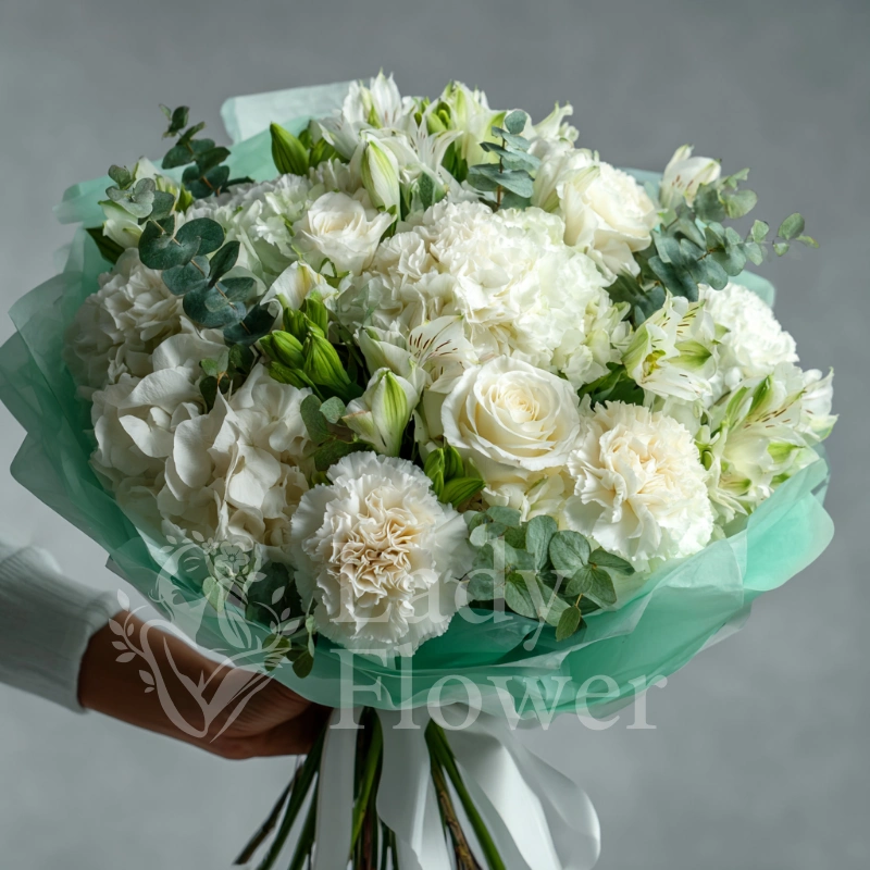 Лёгкий воздушный букет с нотками свежести создаёт ощущение прохлады. Отлично подойдёт для свадьбы, юбилея и дня рождения.