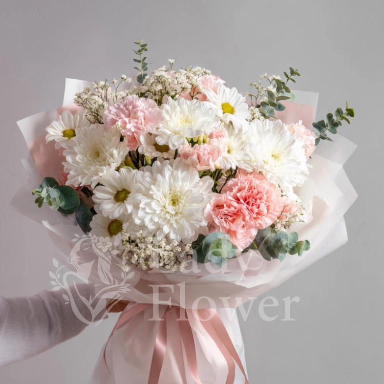 Яркий букет с гвоздиками и хризантемами, украшенный зеленью, идеально подойдет для праздника или чтобы поднять настроение близким.
