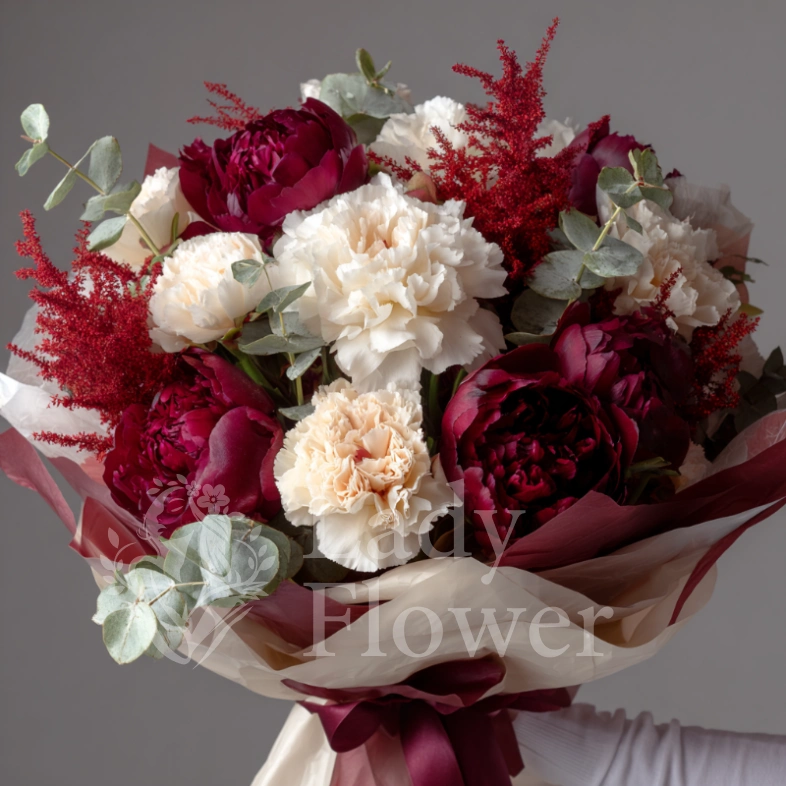ГлавнаяКаталогБукетыПионыБукет с пионами «Бархатный шелест»