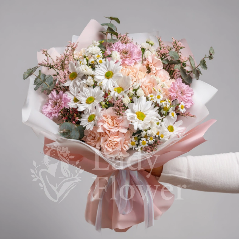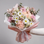 Нежная и пёстрая композиция в стиле «деревенской романтики». Белые хризантемы напоминают о летнем луге, свободе и лёгкости. Отличный выбор для душевных поздравлений и близких людей.