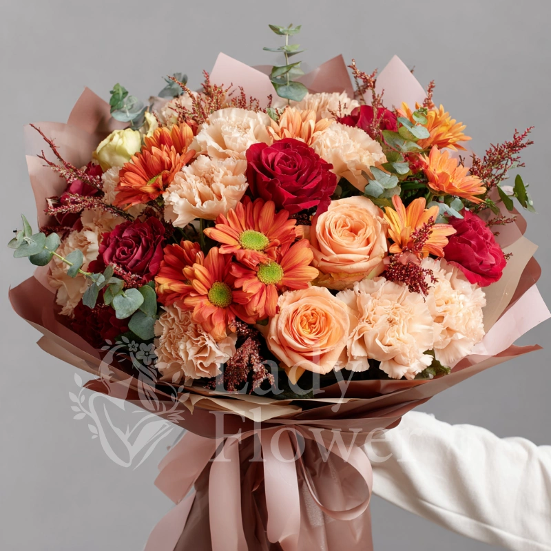 Как разноцветные листья, кружатся оттенки хризантем в этом букете. Каждый цвет — эмоция, каждое соцветие — послание. Букет идеально подойдёт для выразительных подарков в осенний период.