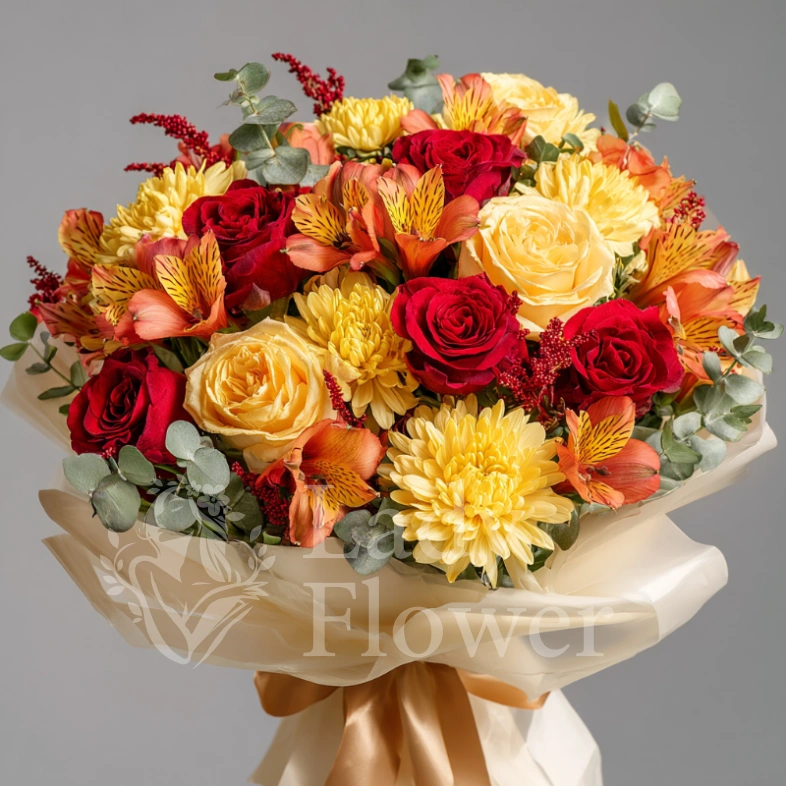 Глубокие, насыщенные оттенки этого букета напоминают о первых холодных вечерах и тёплых шарфах. Хризантемы в нём — как живые огоньки сентябрьского вечера. Стильно, сдержанно и по-осеннему уютно.