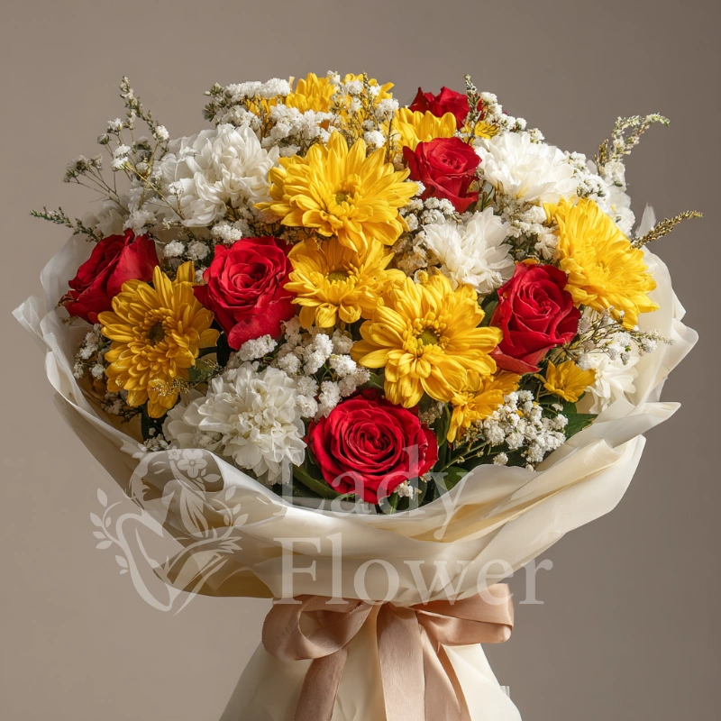 Букет, в котором встречаются солнечный свет и прохлада осени. Хризантемы подчёркивают тёплый посыл, а оформление делает его актуальным как для женщины, так и для мужчины.