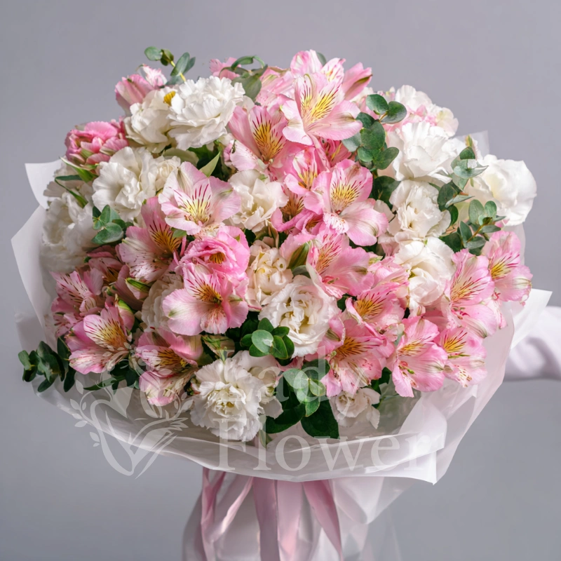Белые эустомы создают образ вдохновляющей легкости. Букет символизирует ясность мыслей и чистоту намерений. Хороший вариант для творческих людей или особенных дат.