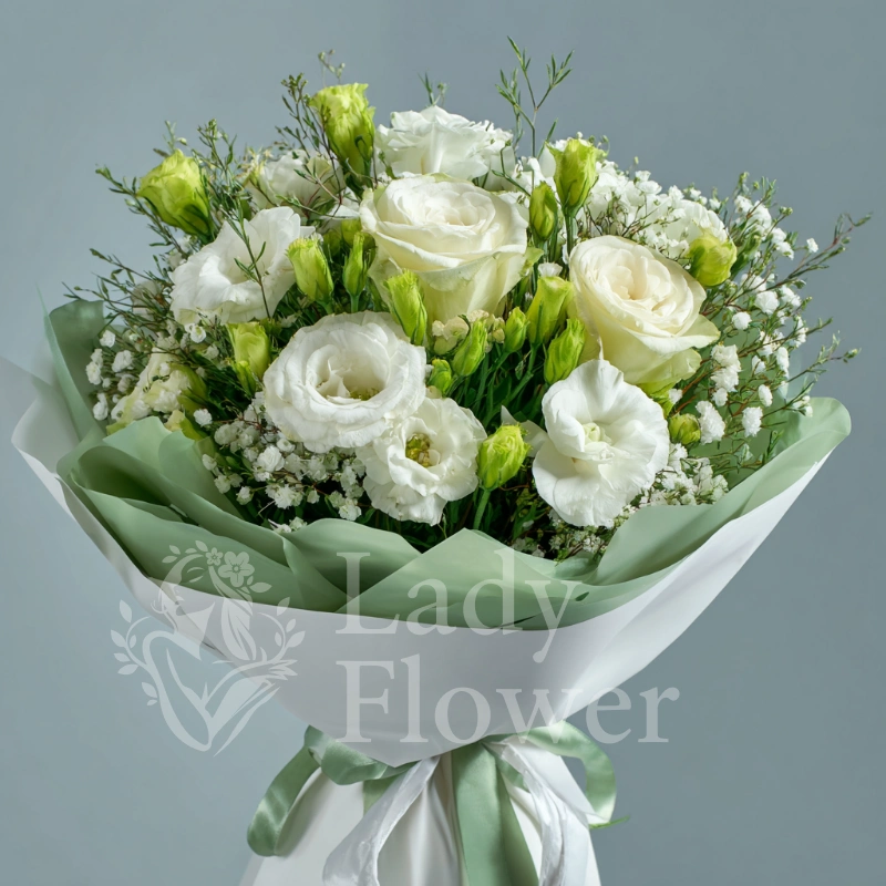 Белоснежная гамма и тонкие стебли — словно звон хрустального ветра. Эустомы придают композиции воздушность и элегантность. Букет, который говорит о любви, уважении и заботе.