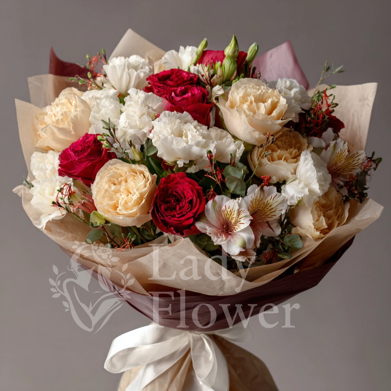 Изысканная композиция на грани сдержанности и утончённости. Эустомы передают хрупкость момента и деликатность жеста. Подходит для подарка тем, кого ценишь и уважаешь.