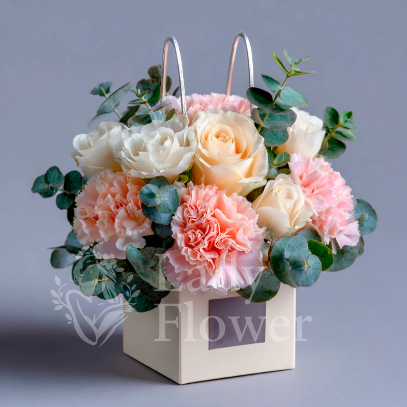 ГлавнаяКаталогКомпозицииВ сумочкахКомпозиция в сумочке «Шарм и утонченность»