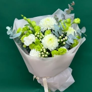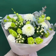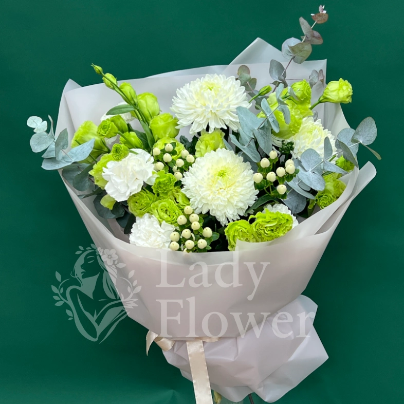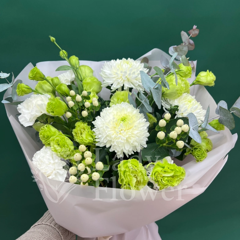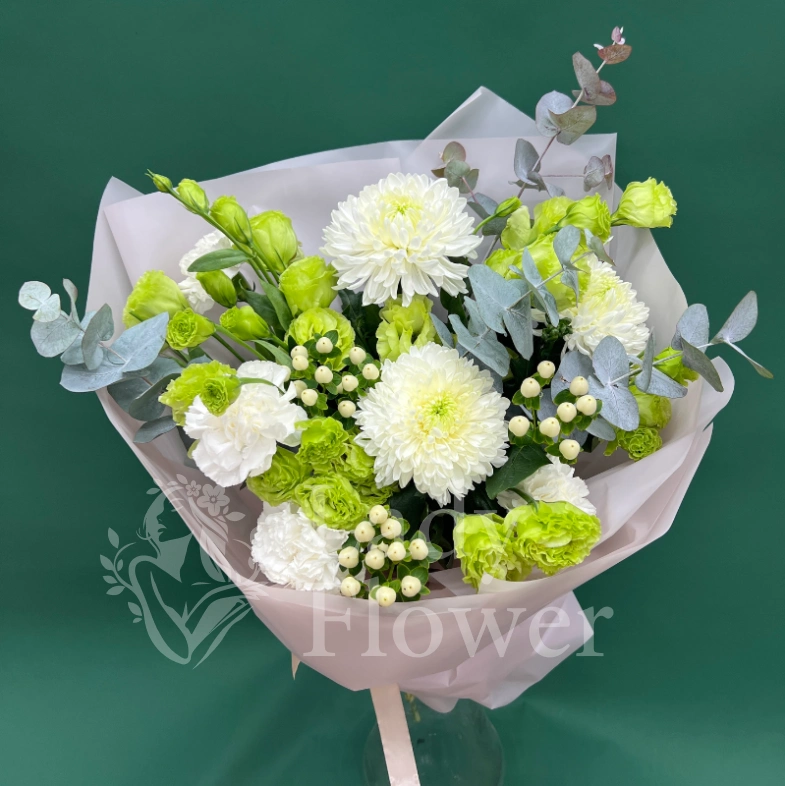 Букет, состоящий из белых хризантем, гвоздик и зелёных эустом, создает элегантную и нежную композицию. Хризантемы придают букету воздушность и пышность, а эустомы добавляют яркий акцент. Дополненный белыми ягодами и листьями эвкалипта, букет выглядит свежим и стильным, идеально подходящим для любого торжества.