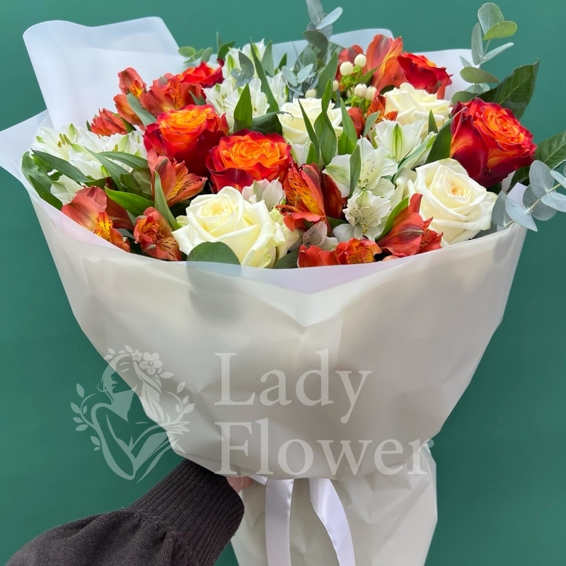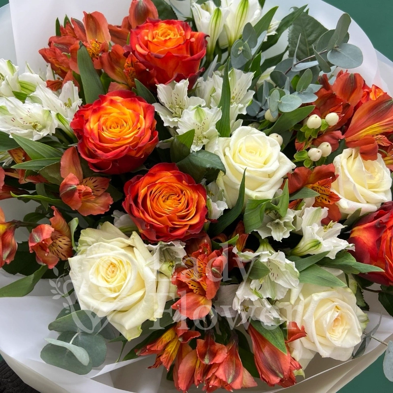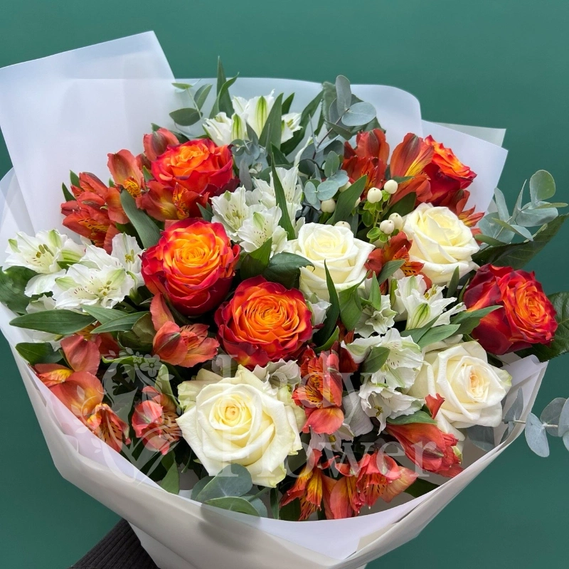 Розы, альстромерии и эвкалипт создают эффектную и ароматную композицию в мягких тонах. Сочетание белых и оранжевых оттенков добавляет букету элегантности и яркости, идеально подходя для любого торжества. Этот букет станет прекрасным подарком, способным выразить самые искренние чувства.