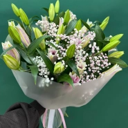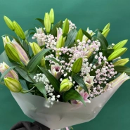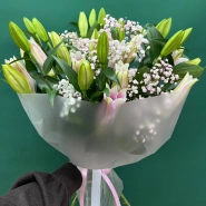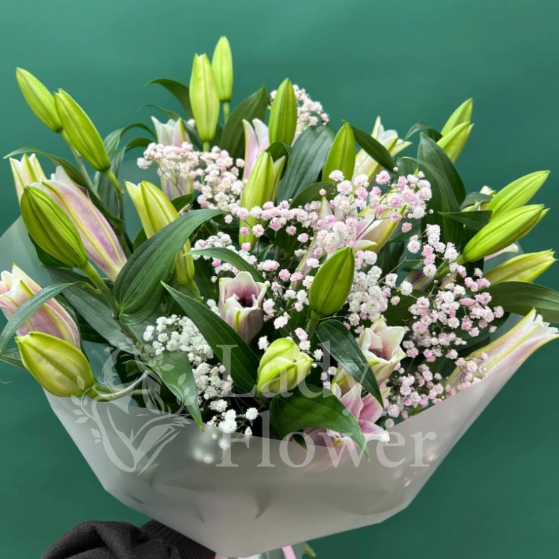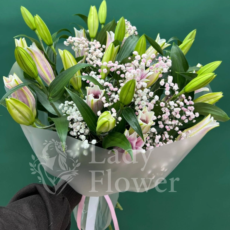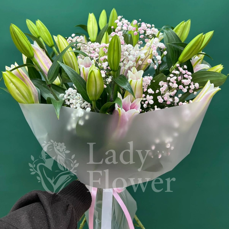 Букет из лилий и гипсофилы, выполненный в нежных оттенках белого и розового, станет прекрасным подарком для самых дорогих людей. Хрупкие цветы гипсофилы эффектно дополняют крупные бутоны лилий, добавляя композиции воздушность и легкость. Этот букет символизирует нежность, элегантность и безграничную любовь.