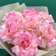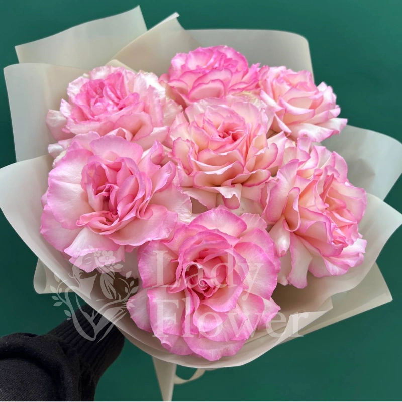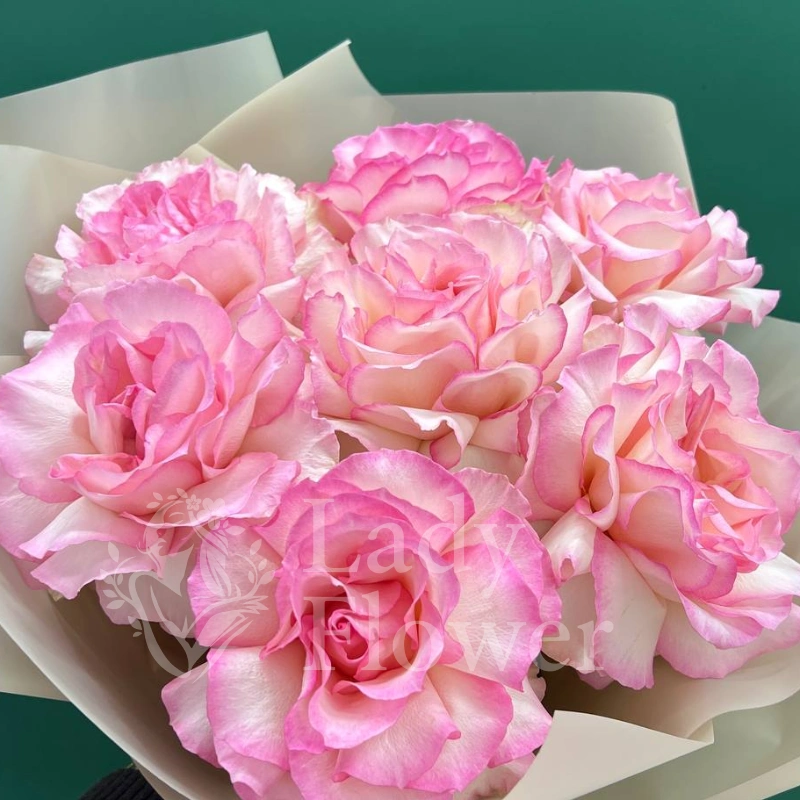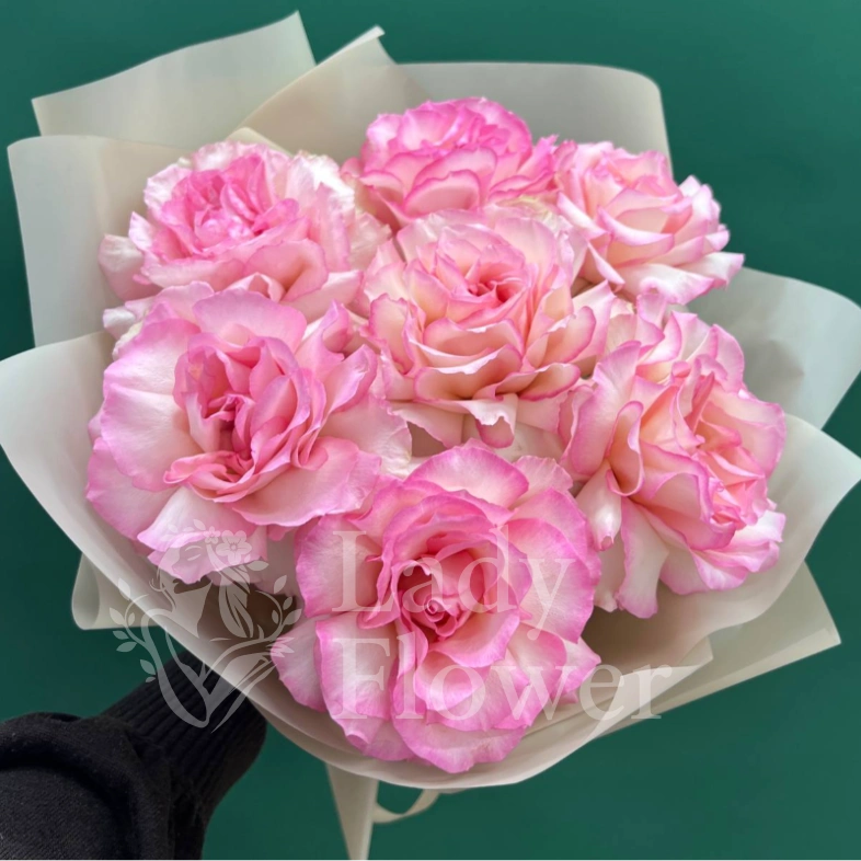 Букет, состоящий из нежных розовых роз с тонким переходом оттенков от светлого к более насыщенному краю лепестка. Необычный цвет и классическая форма делают букет элегантным и универсальным подарком. Розы, завёрнутые в белую упаковку, создают впечатление воздушности и лёгкости.