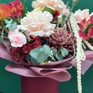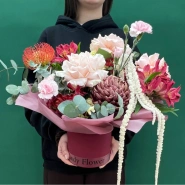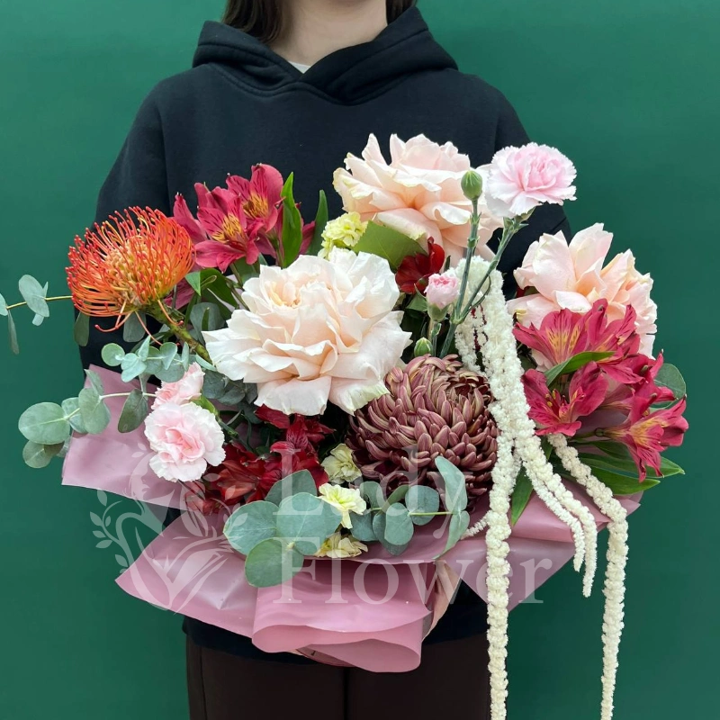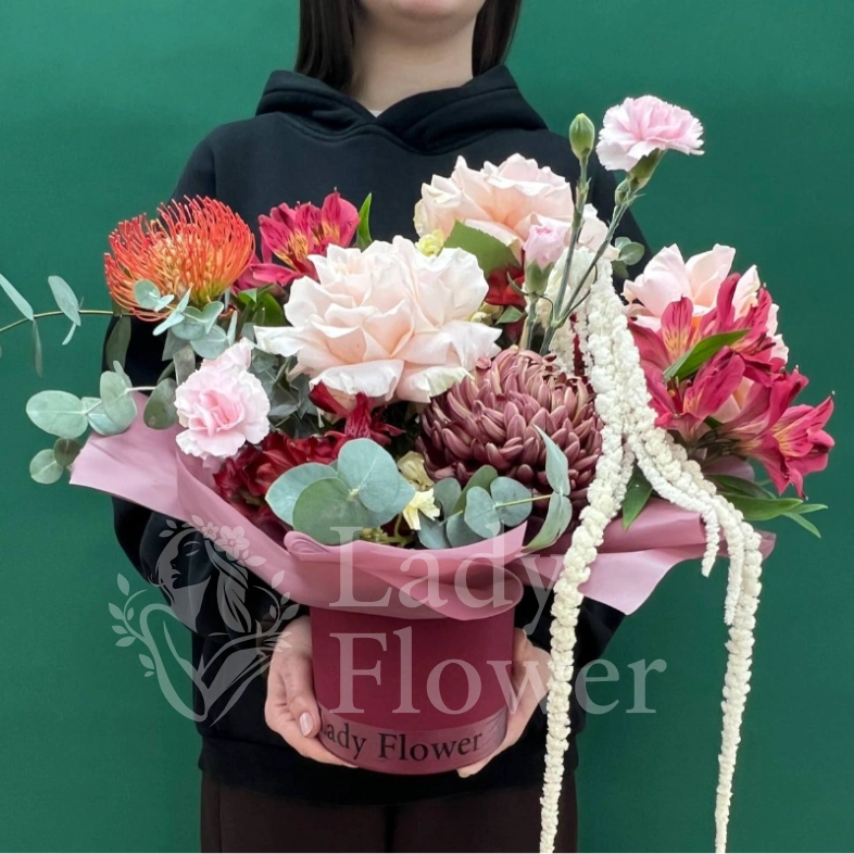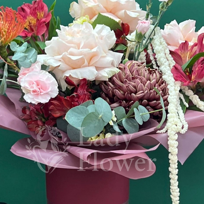Этот букет - нежная композиция из розовых и красных цветов, дополненная свежими листьями эвкалипта и белыми соцветиями. Букет украшен легкой упаковкой из розовой бумаги, что придает ему воздушность и элегантность. В коробке " " это произведение флористического искусства станет прекрасным подарком для любого торжества.