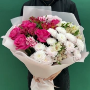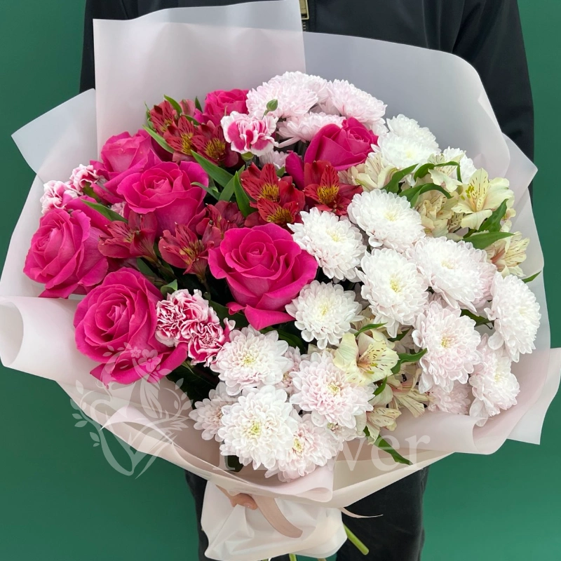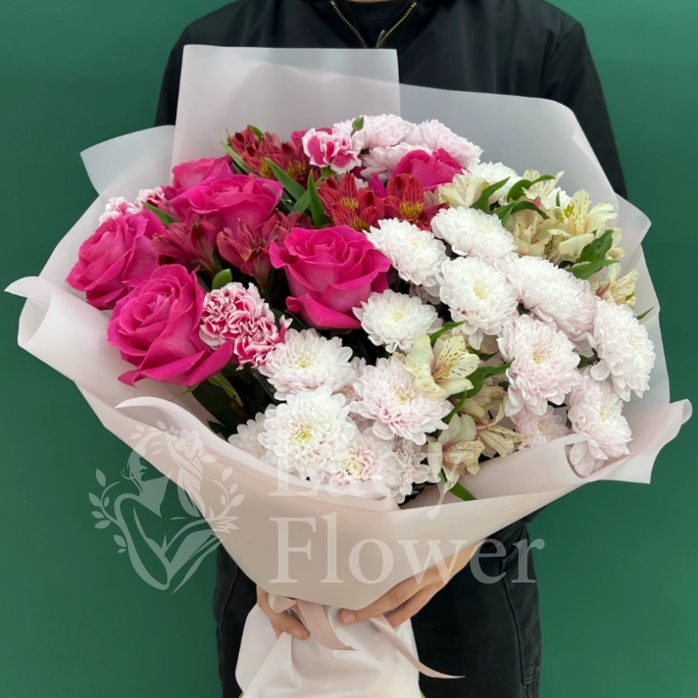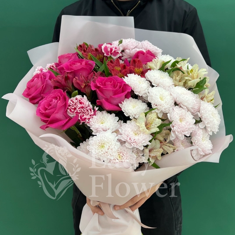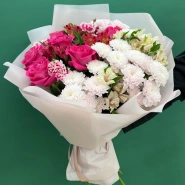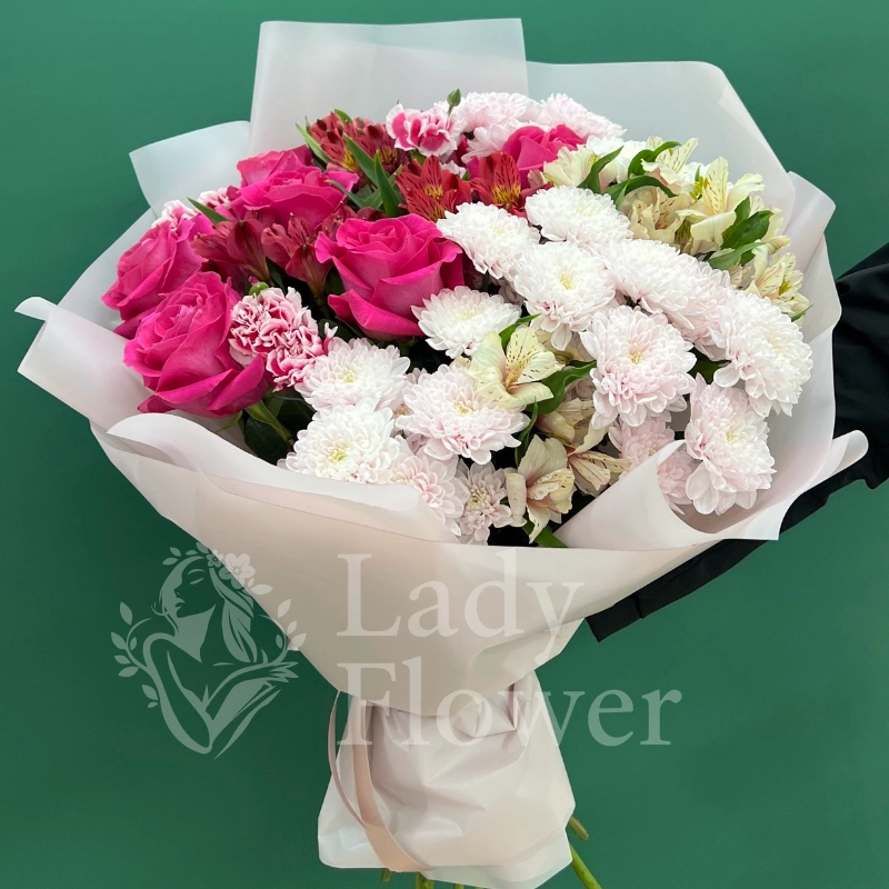 Букет цветов в мягких тонах: розовые розы, нежно-розовые хризантемы,альстромерия и кустовой диантус. Композиция выполнена в нежных оттенках, что делает её подходящей для различных поводов. Букет выглядит элегантно и гармонично, привлекая внимание своей простотой и красотой.